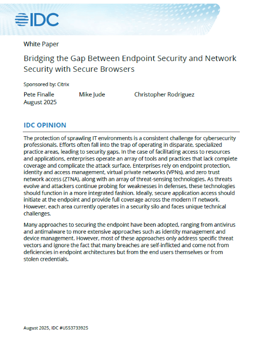 The IDC Whitepaper: Bridging the Gap Between Endpoint Security and Network Security with Secure Browsers explores how organizations can strengthen their cybersecurity posture by unifying endpoint and network protection through secure browser technology.
