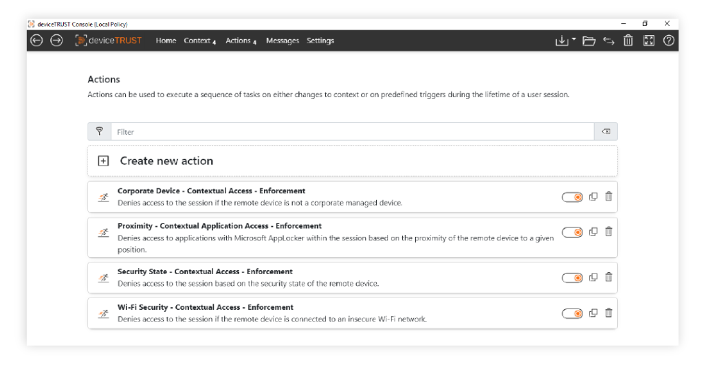 deviceTRUST uses your defined device context to alert real-time actions that protect your environment. These actions, both built-in and custom-created via APIs, control access to workspaces, sessions, and applications, securing your data in every situation. From locking user sessions and managing application access to configuring digital workspace policies and triggering OS/3rd party APIs, deviceTRUST offers a range of responses. Because context changes trigger immediate action execution, security checks are always current.
